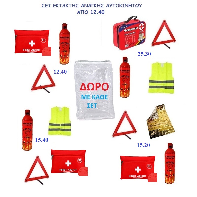 1ο σετ 3 τεμαχίων στα 12.40: 1 Φαρμακείο σε μικρό τσαντάκι 16x12cm, 1 τρίγωνο ασφαλείας σε χάρτινη θήκη, 1 πυροσβεστήρα Lion 750ml χωρίς βάση και 1 σακούλα συσκευασίας που περιέχονται τα παραπάνω