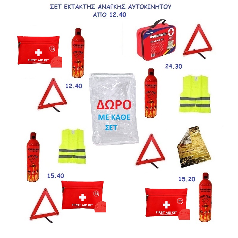 4ο σετ 4 τεμαχίων στα 24.30: 1 Φαρμακείο μεγάλο πλήρες, 1 πυροσβεστήρα Lion 750ML χωρίς βάση, 1 τρίγωνο ασφαλείας και 1 γιλέκο ανακλαστικό XL και 1 σακούλα συσκευασίας που περιέχονται τα παραπάνω